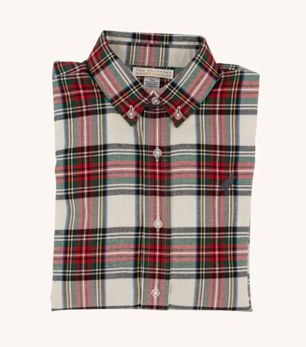 The Beaufort Bonnet Company Dean's List Dress Shirt is the perfect holiday staple for his wardrobe this season! Featuring Keen Place Plaid with Richmond Red Stork, he's sure to look festive and handsome in this button down!