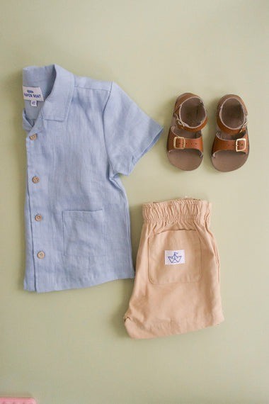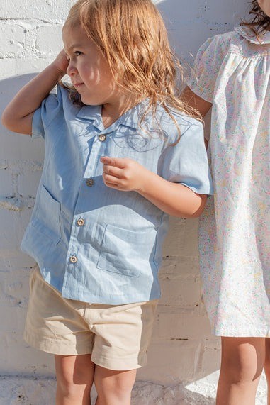 Our short sleeve, collared button down top features a pocket on the bottom, left side and is a great way to dress up an outfit. Pair with any of our James shorts to complete the look.
