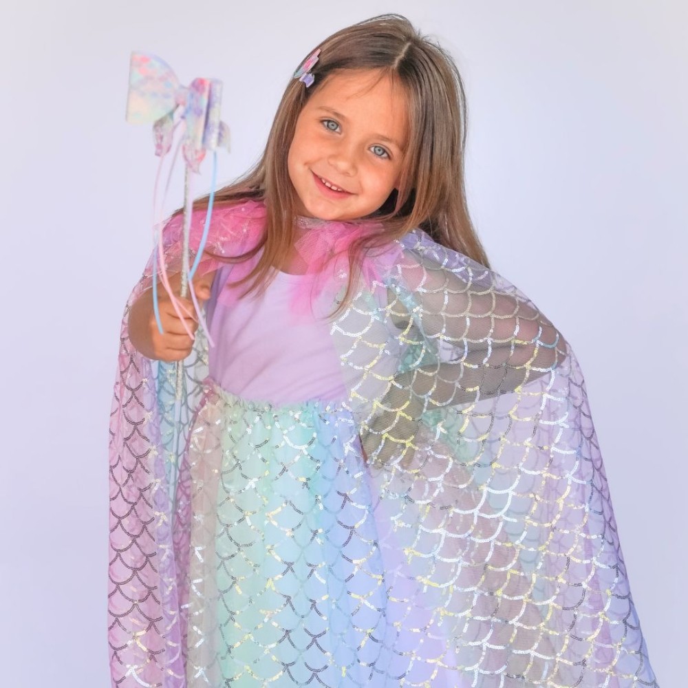 Color: Lavender cotton bodice with a soft rainbow ombre tulle skirt and silver glitter scale overlay