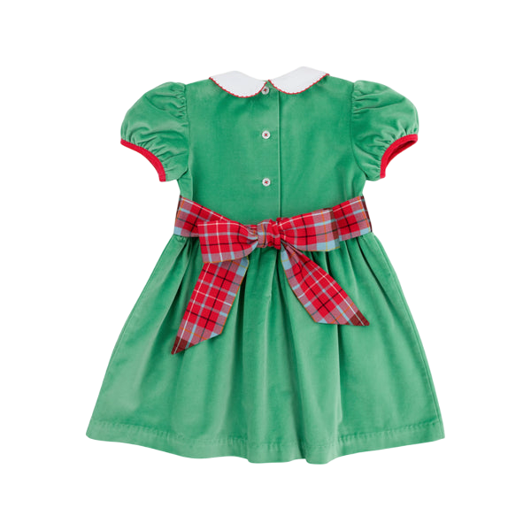 Our Cindy Lou Sash Dress in Kiawah Kelly Green Corduroy with Worth Avenue White collar & Wilson Pier Plaid is the perfect party dress for your little lady! This dress combines charm and cheer, making it a standout choice for a magical season.
