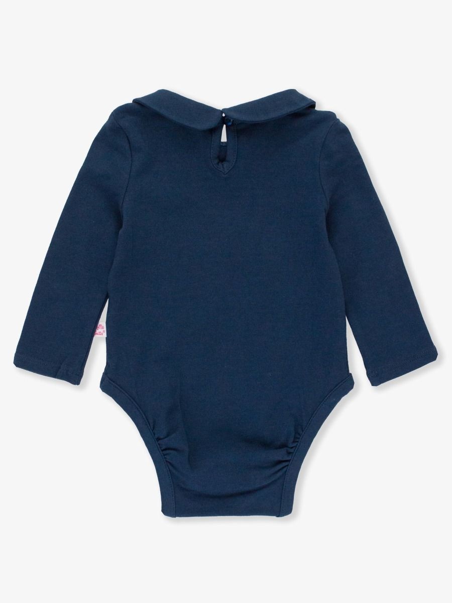 This bodysuit is a perfect blend of comfort and style, making it an essential addition to your child's summer clothing collection. So, let your little girl step out in style with this dark navy Peter Pan collar bodysuit.