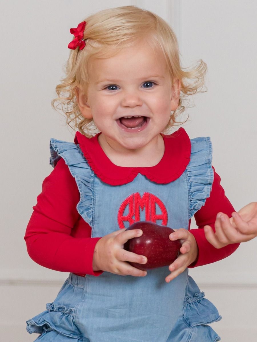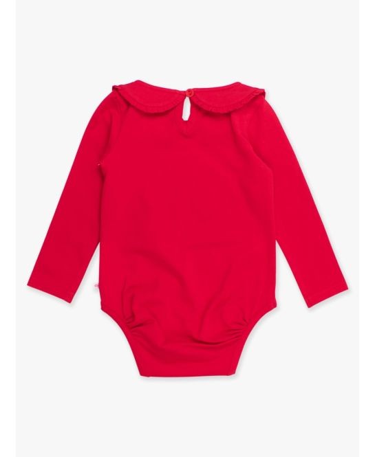 This red ruffle bodysuit is enhanced with personalized options like monograms, available in single or double names, adding a unique touch to your child's outfit. It's designed with practical elements such as a keyhole closure at the back and convenient snaps at the bottom, ensuring easy dressing and full seat coverage.