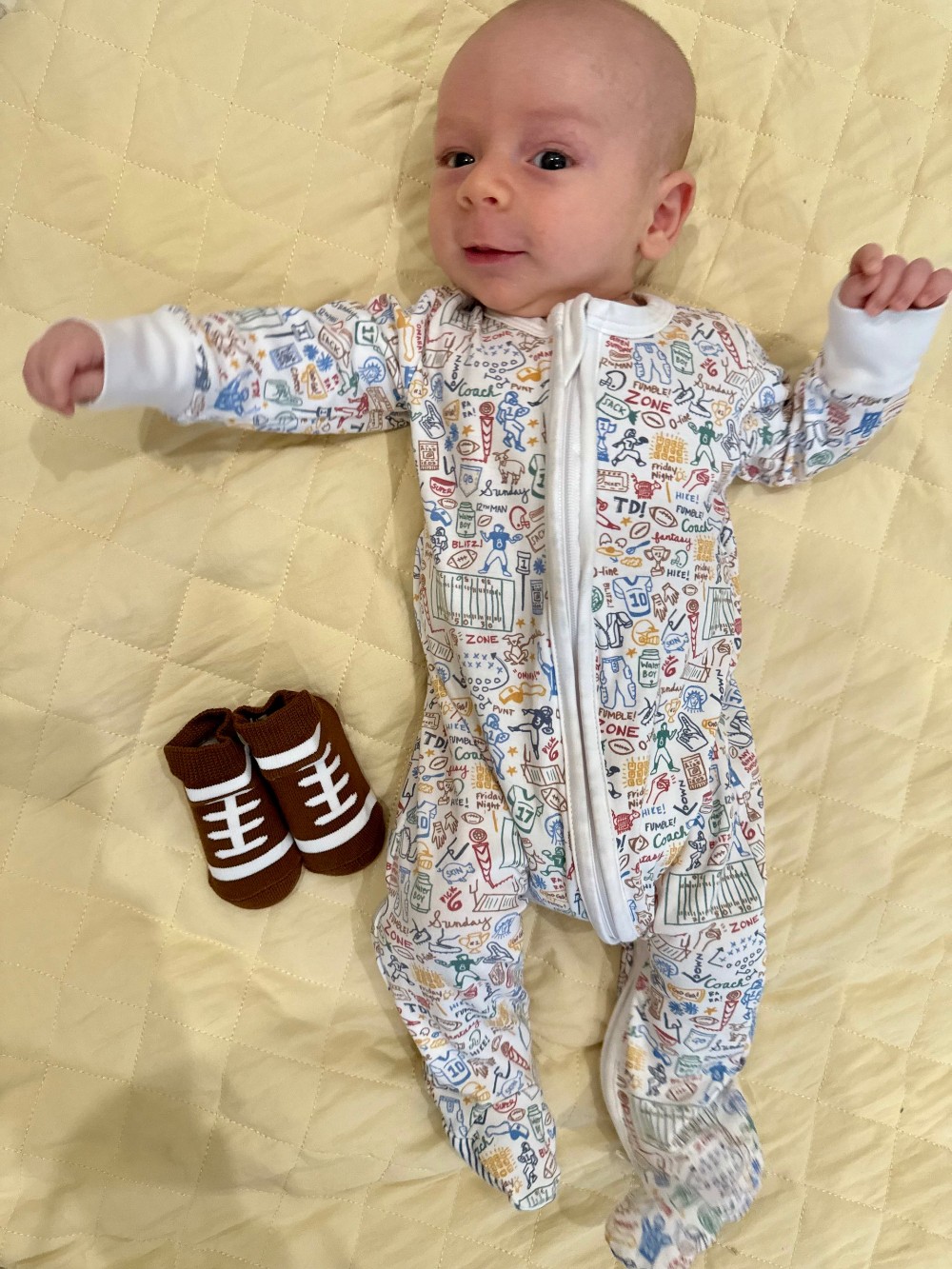 Our Football print zip baby onesie features all of our favorite game-day icons. From footballs and helmets to goalposts and snacks, this playful print celebrates everything we love about the sport!