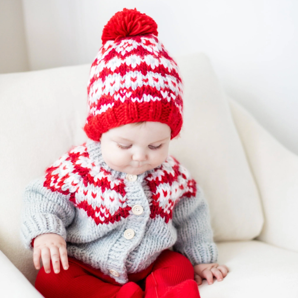 ransform your child's winter wardrobe with our Fairisle Cardigan Sweater. This sweater features a Nordic-inspired design in a ice grey, white and shades of red in a cozy, thick knit. Complete the look with our matching Fairisle Red beanie hat - the perfect gift for any little one.