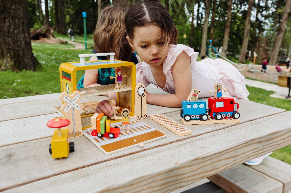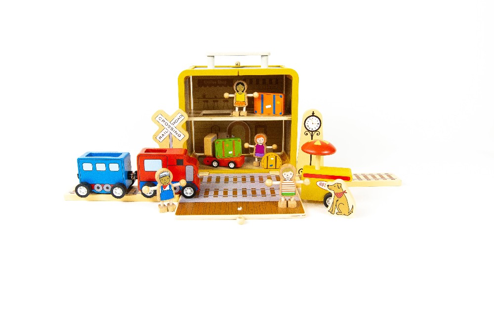 ALL ABOARD! Part of our new Suitcase Series that encourages portable play, our Train Station suitcase opens up on both sides to reveal a world of fun. This 16-piece set will let your child’s imagination run wild with train station stories. Includes travelers, crossing signal, extra track, luggage, hot dog...
