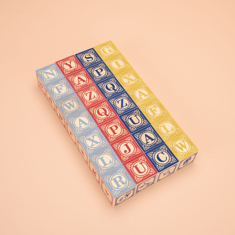 Expand your knowledge of France with 28 French language blocks. Enjoy the embossed fleur-de-lis filigree. This stylized detail surrounds two capital letters on opposing sides of each block. Two other sides show one number and one animal paired with their French translations. Two more hand crafted letters make four complete alphabets.