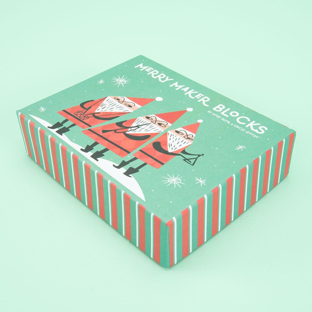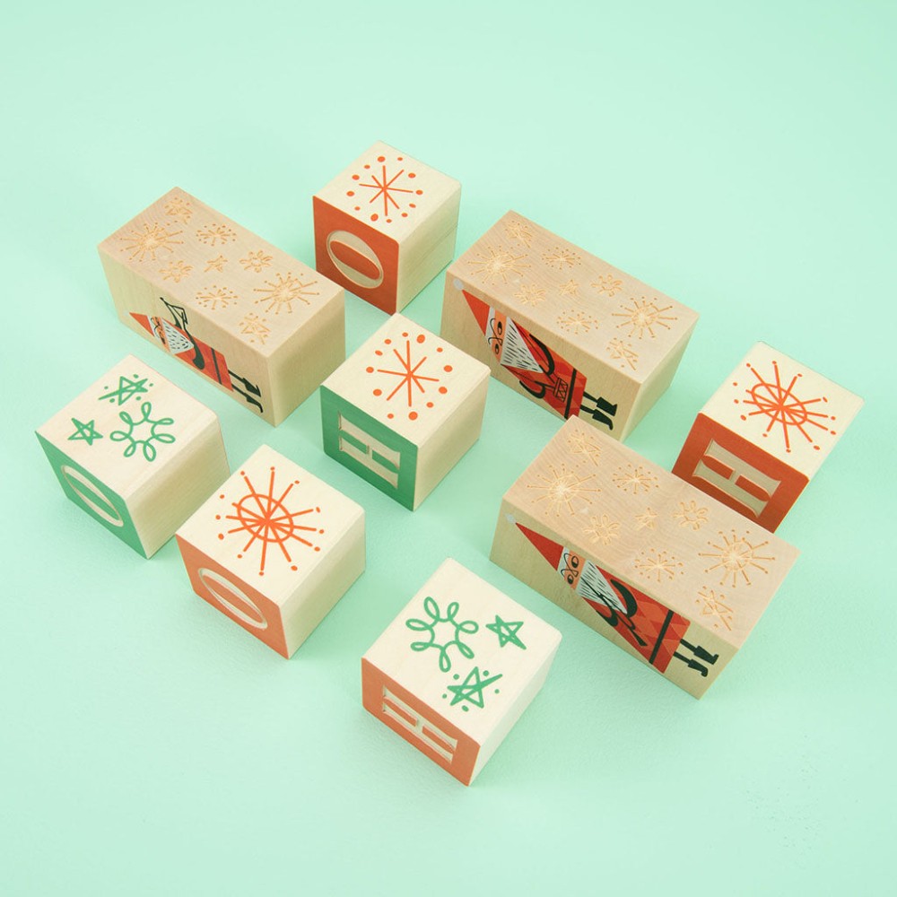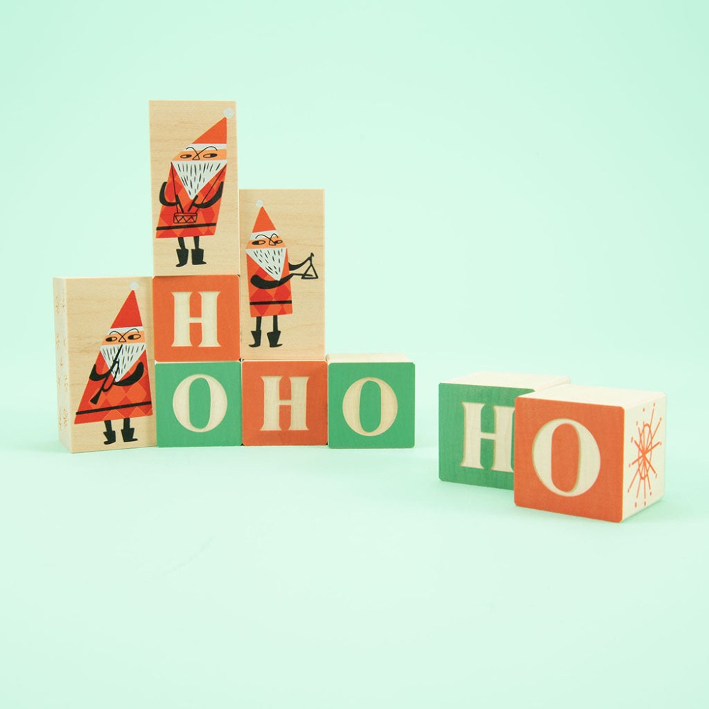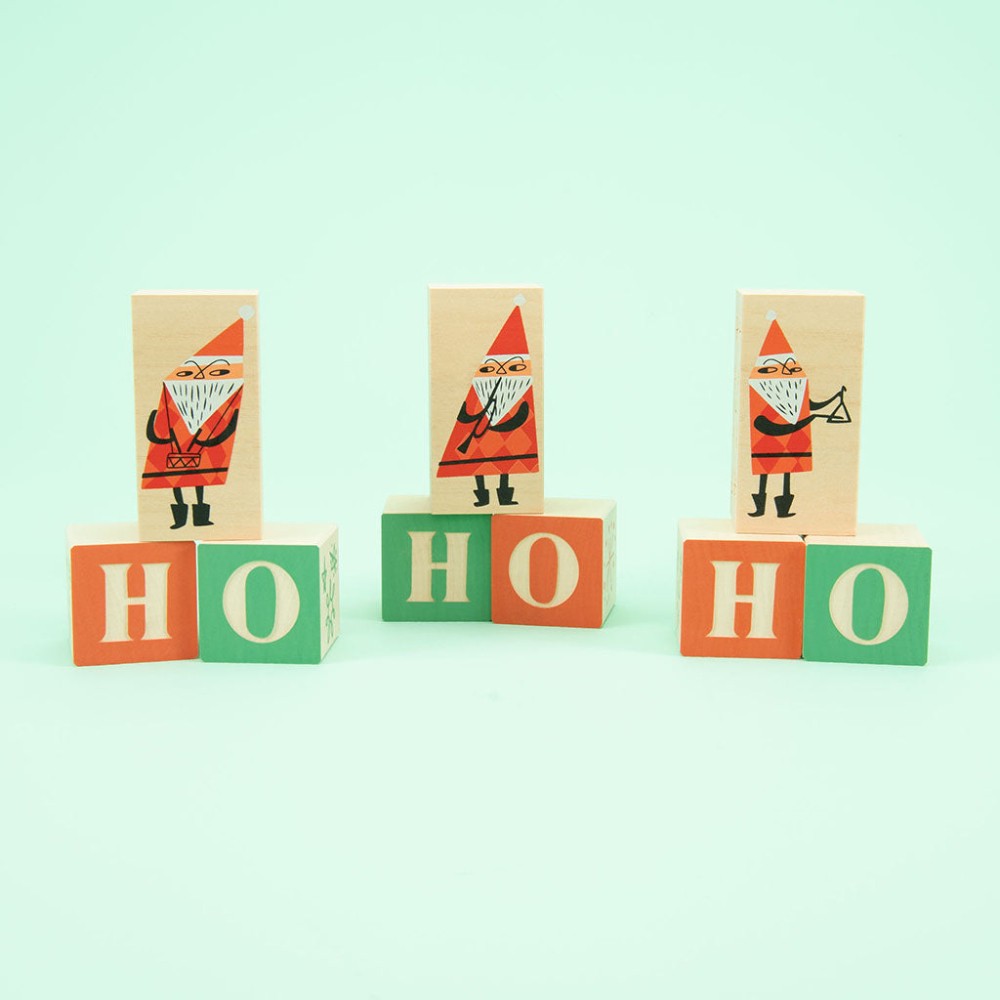 Three tall blocks feature a Mary Blair Santa illustration. In one, you'll see Santa playing a drum. In another, you'll see him playing a triangle. The third Santa blows his own horn. Enjoy the debossed snowflake and star designs on opposing sides of each Santa block. You can spell "Ho, Ho, Ho" with six red and green debossed blocks featuring hand-printed illustrations on opposite sides.